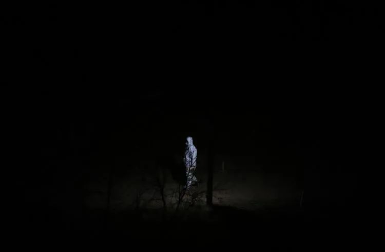 ▲1月20日晚,融汇社区,一名身穿防护服的工作人员从路灯下走过。