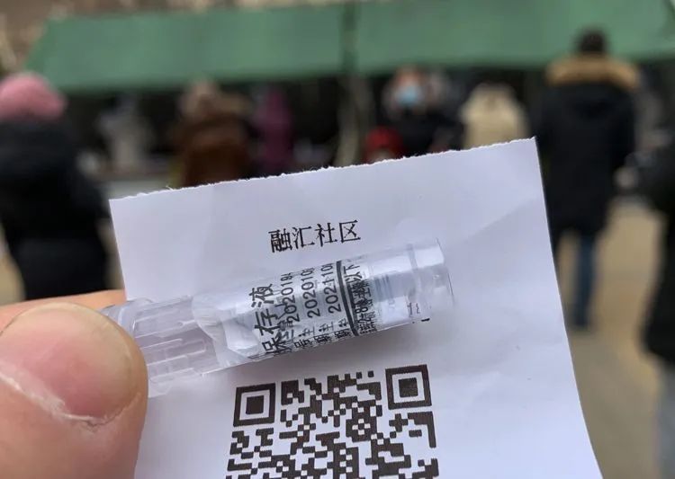 ▲1月23日12:24分,融汇社区,居民手持身份二维码和装有核酸采样保存液的试管。