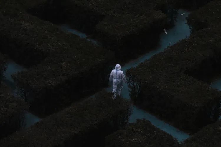 ▲1月27日16时58分,融汇社区,工作人员穿过植物迷宫。