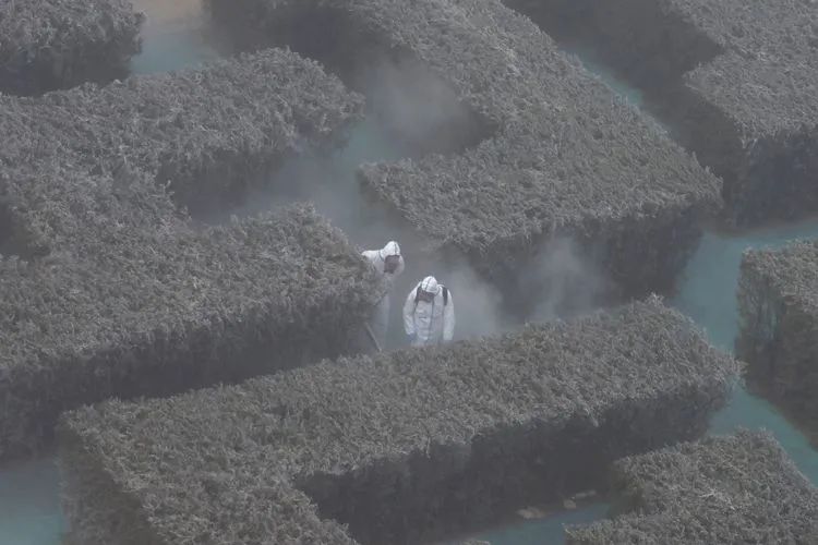 ▲1月26日10时,融汇社区植物迷宫,工作人员对环境进行消杀。