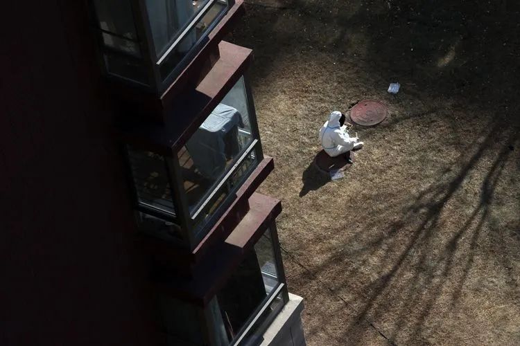 ▲1月29日12时25分,融汇社区,一位疫情防控人员席地而坐,一边晒太阳一边吃午饭。