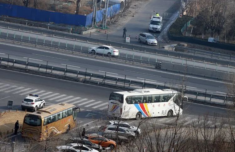 ▲1月21日10时48分,融汇社区外,数辆大巴依次驶入京开高速辅路,前往集中隔离点。京开高速路东侧的天北路也采取了交通管控。