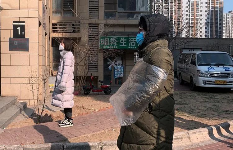 1月23日10时55分,融汇社区,居民们准备去做第三次全体核酸检测,一位阿姨用塑料袋防护双臂。