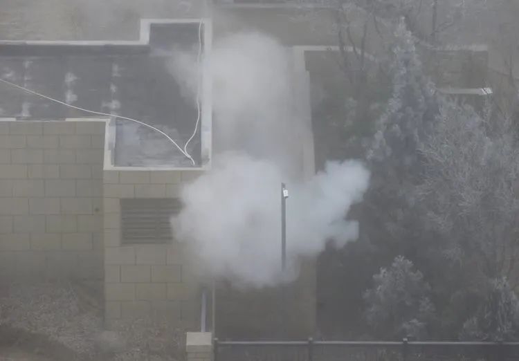 ▲1月26日9时56分,融汇社区,工作人员在大雾中喷洒消毒烟雾。