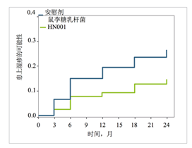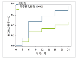 (图一)服用安慰剂或鼠李糖乳杆菌 HN001 的婴儿 SCORAD >10 的 2 年累积发病率