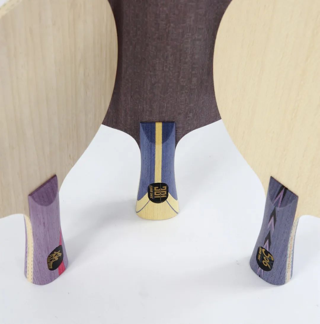 异质面材+内置芳碳结构,正面(有标牌面)为中等硬度的林巴面材,反面则为偏软硬度的阿尤斯面材,通过硬件差异来实现“正手硬反手软”的体验,从而达到速度与稳定兼备的效果。