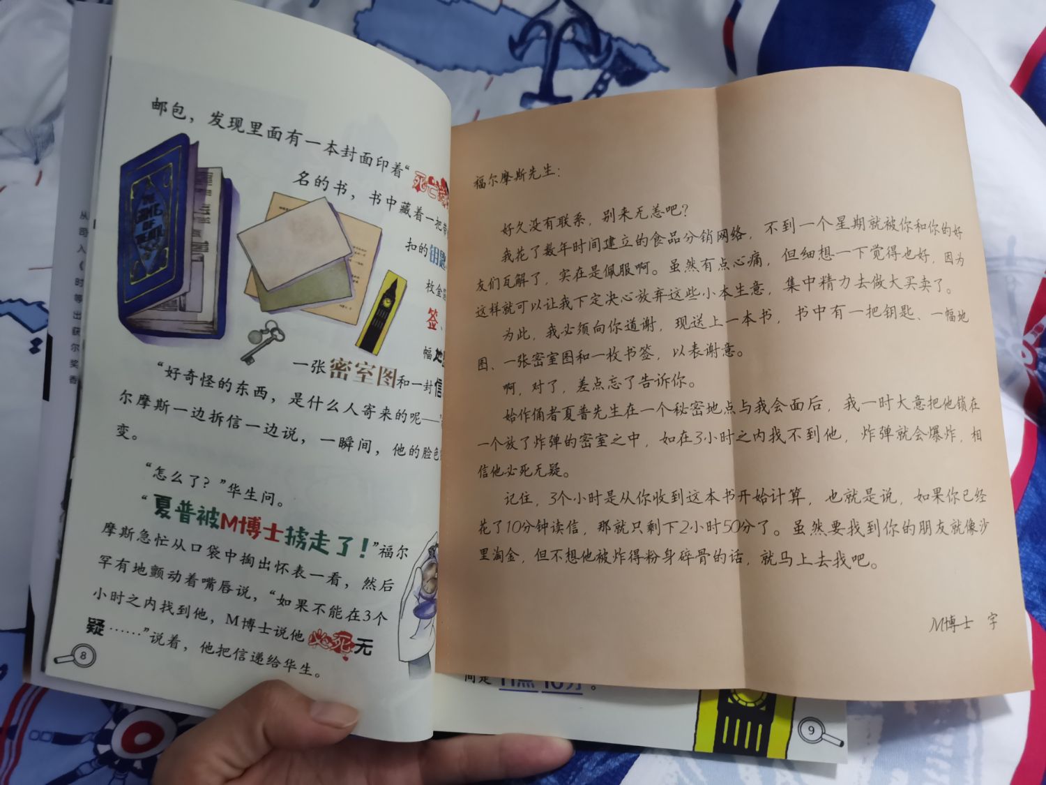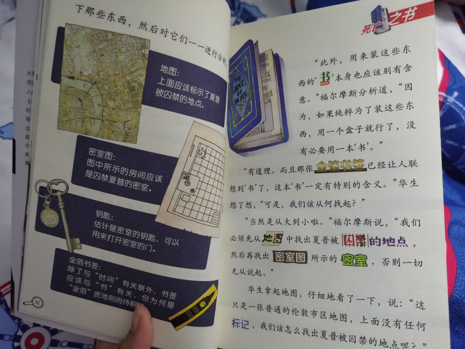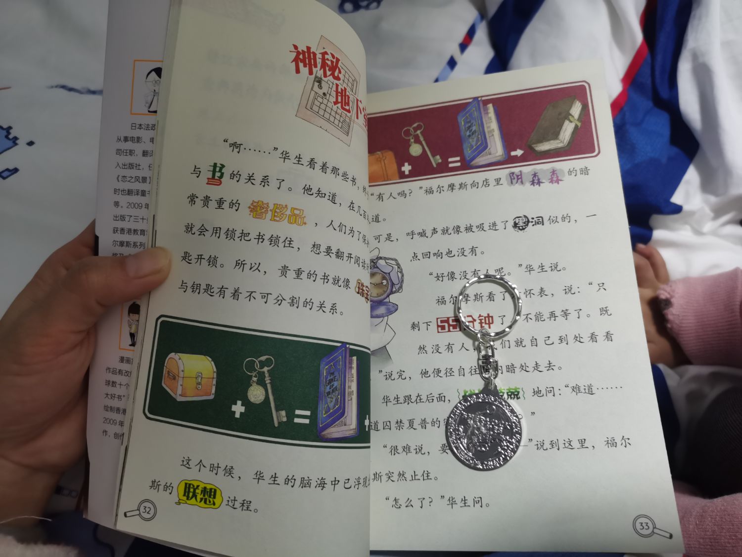 给哥哥买的《大侦探福尔摩斯》全集收到了,哥哥迫不及待地拆了这本,因为书中附赠了一枚镀银钥匙扣,和书中M博士寄给福尔摩斯的钥匙扣一样,哥哥说,“我还差一把钥匙就能把密室打开了。”