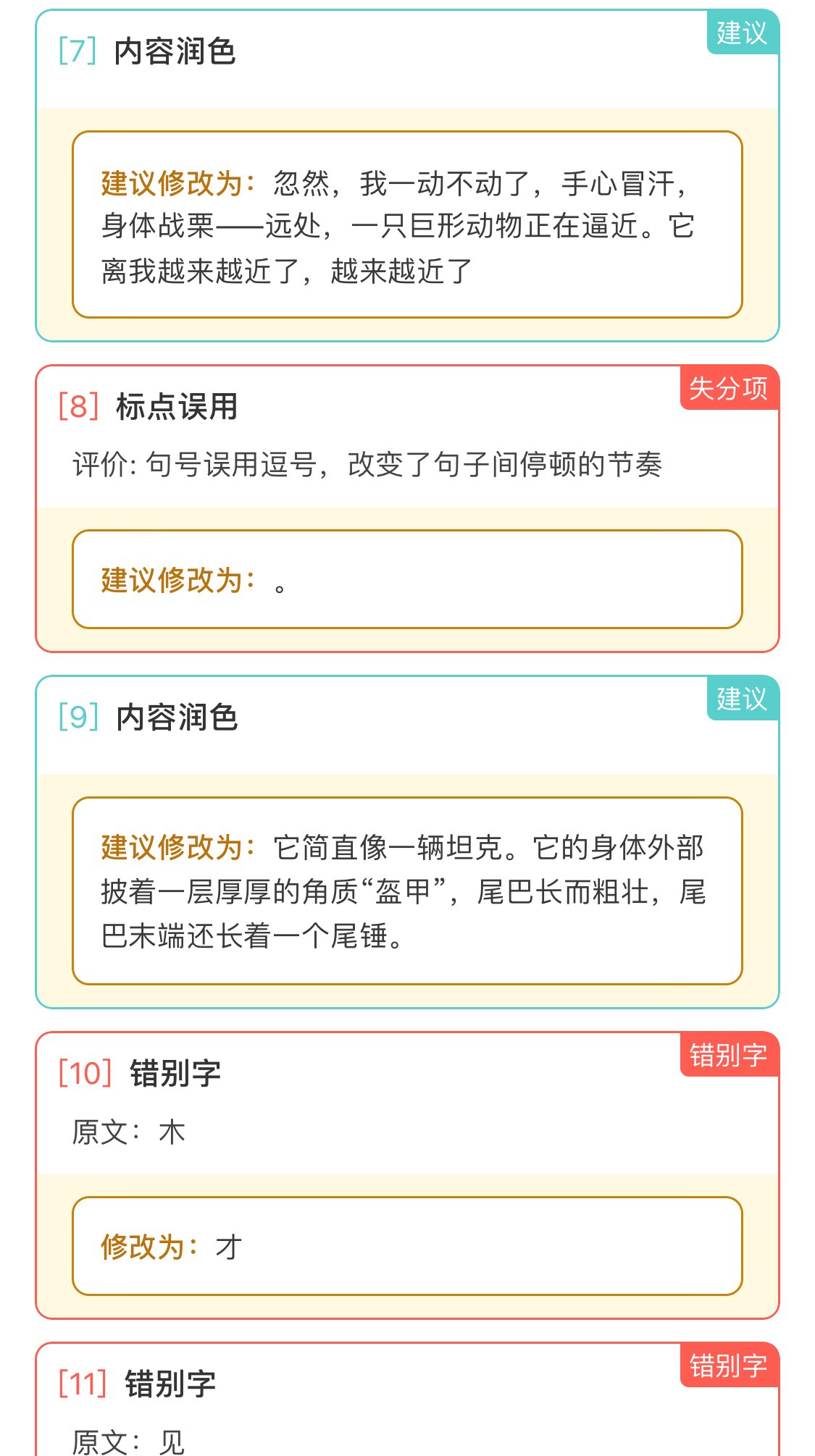比如:错别字、标点漏用、多余字、用词不当、语言啰嗦、审题/立意、叙述描写、结构逻辑、中心、细节等等,在批改之中都会涉及。多维度分析作文中所有问题,指出问题及时纠正。