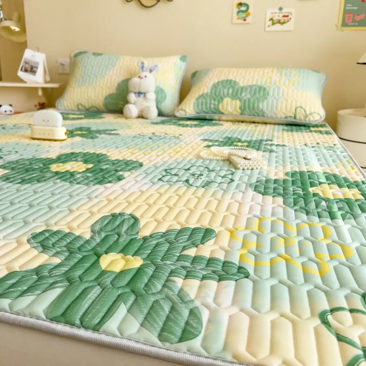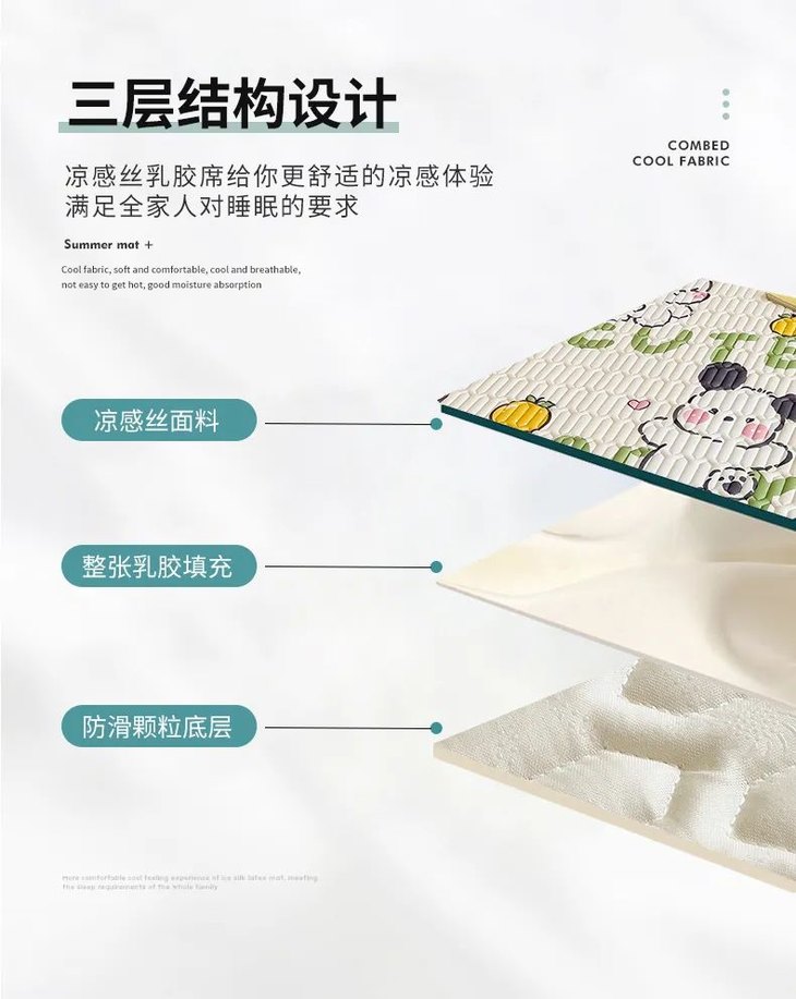 它是三层结构设计,表层凉感丝面料+中间整张乳胶填充+底部防滑颗粒,席面松软不塌、凉而不冰,躺上去就有种走进空调间的感觉,驱散体内所有热气。