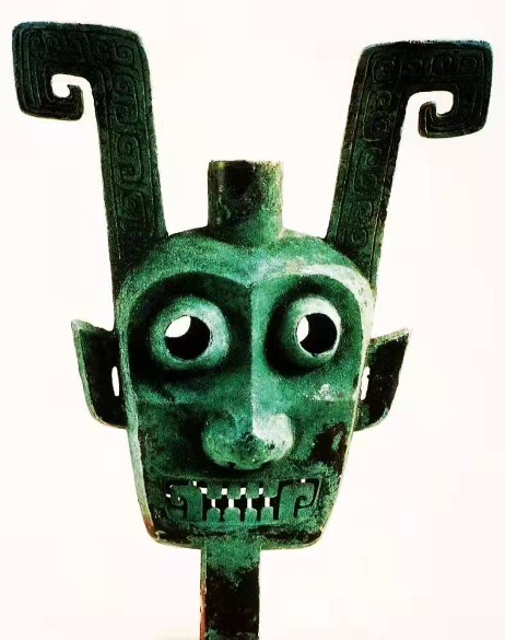 从另一个方面来讲,同一时期中原地区商代的甲骨文中,实际上就有“蜀”这个字,这个字和现在我们看到的青铜面具很可能是有所关联的。从字形上看,中原商代甲骨文中“蜀”字:其上部是一个巨眼,下部是卷曲的、蝌蚪式的身体。在三星堆祭祀坑中,出土了一种青铜面具,他们原本应该安插在粗大的木柱上,这些铜面具的眼睛被夸张,其明显特征引人注目。眼睛的表现形式有两种,数量较多的是巨目呈杏核状,目中间有一道横脊,第二种眼睛呈柱状突出,鼻子挺阔,两耳巨大,嘴阔至耳根,嘴角上翘呈微笑状。其中最大的一件面具,其鼻子上方还有一个卷云装饰物。纵目这一特征使人联想到古蜀国第一王——蚕丛,《华阳国志》记载:“蜀侯蚕丛,其目纵,始称王”。