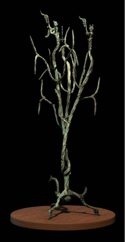 3号坑青铜神树三维复原效果。《山海经》中所记载的“汤谷上有扶桑,十日所浴,在黑齿北。居水中,有大木,九日居下枝,一日居上枝”被一些人认为是青铜神树的文字佐证。