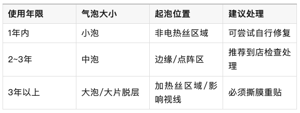 ❌ 用了几年后膜起泡,大多数时候是老化+粘胶失效,下面这些情况建议不要自己动手: