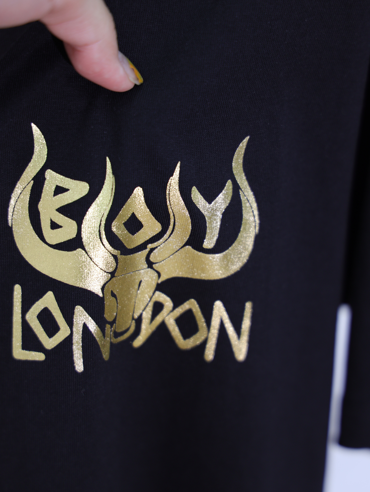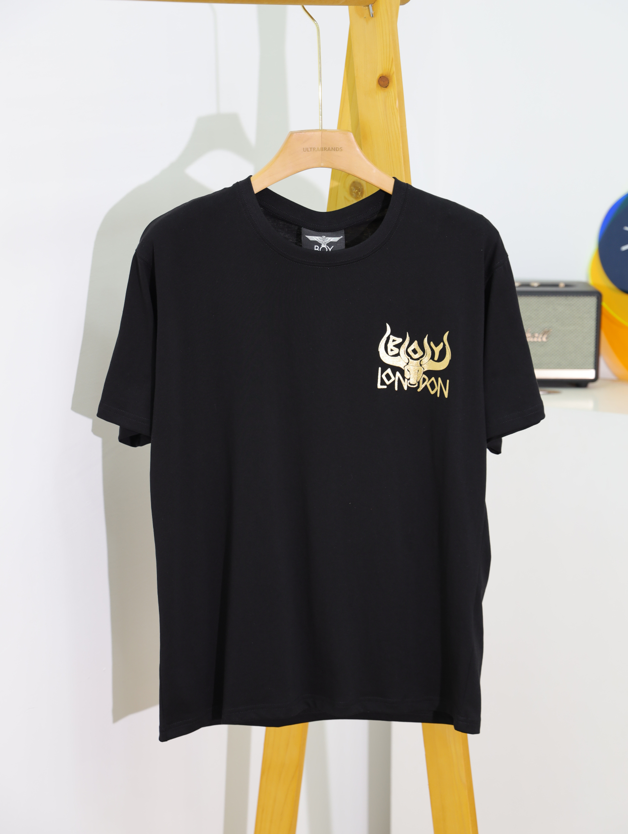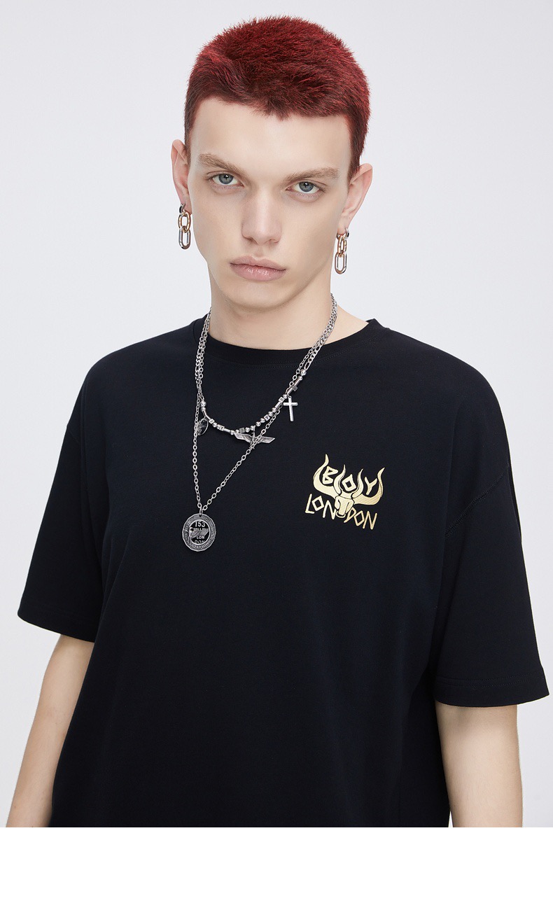 金色牛头LOGO印花 黑色宽松落肩短袖