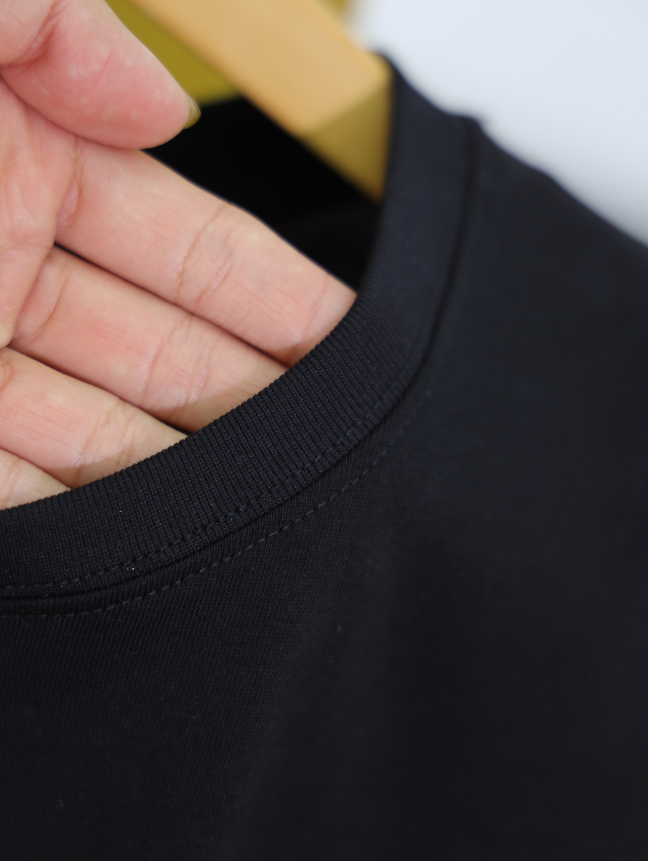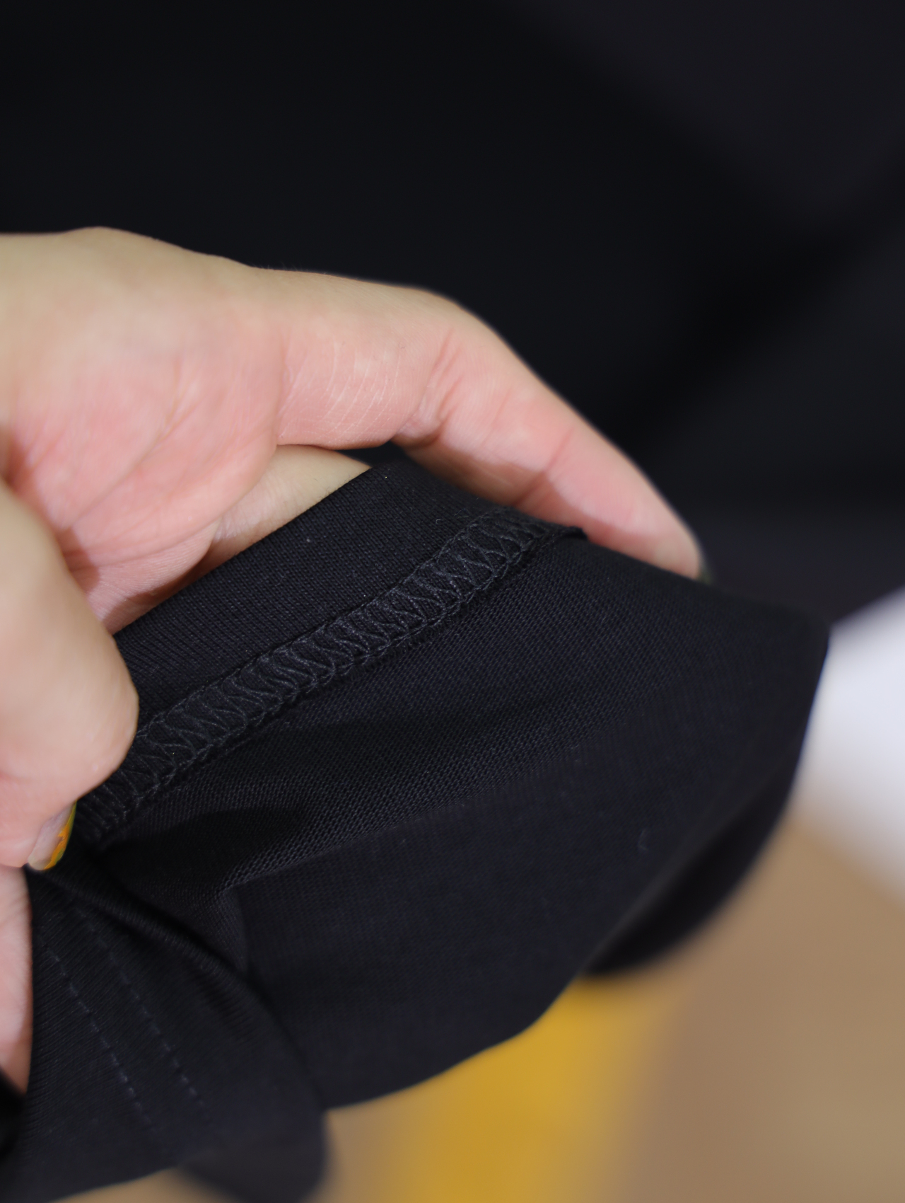 领口做了独立的横基螺纹包裹,同样的竹节纱面料,带有一定弹力