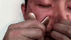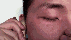 上眼眶刮完后,同样的手法,刮拭下眼眶。有个要领,眼睑处手法轻些,滑过眼睑后力度可加重,到达耳前可稍稍加压,停顿片刻。