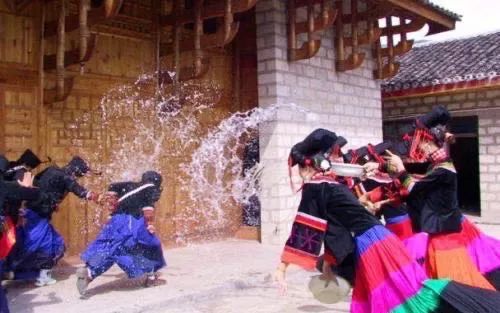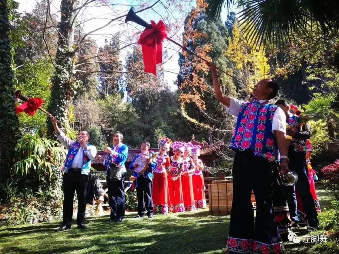 迎亲——举行婚礼这天,男方家喜气洋洋、亲朋满座。院子中间用树枝搭起一座青棚,棚内外披红挂彩,正中摆放彝家喜神牌位。彝家歌手演唱着富有民族情调的青棚调,亲朋好友欢聚一堂,歌声不停、唢呐声不断。男方家聚亲的队伍来到女方家门前时,要接受女方的兄弟姐妹和同辈青年男女的泼水,以示欢迎和庆贺。彝家人认为:泼了水,姑娘到丈夫家后就不会到很远的地方背水,即使天旱也有吃有喝。娶亲的队伍进了女方家门后,在供桌上点上香、磕完头,接着就开始展示带来的礼物,女方也展示姑娘的嫁妆。这时,由女方父母请来的歌师开始唱娶亲歌,唱一段、展示一样,且唱到什么就必须展示什么,不然歌师就要用簸箕在娶亲人的头上打三下,引得众人哄堂大笑。展示完毕后,女方家招待娶亲的人喝水:先喝茶、后喝糖水,称为"先苦后甜"。接着摆好香槟,请女方的舅辈来说一些吉利的话,然后打开红盒,给新郎披上两匹红彩带。一切完毕之后,女方家盛宴招待娶亲的人、亲朋好友以及本村本寨的乡亲。席间,新郎要到每一桌先作揖,后敬酒。等所有的客人都吃完饭后,才能娶新娘动身回家。如果路远,女方家会热情地招待娶亲的人住下,第二天再走,当晚,女方家院子里或房外广场上,人们通宵达旦地跳左脚舞。如果路近,当天就可以娶亲回家。当人们进行上述活动的时候,新娘一般在楼上梳妆打扮,作出嫁前的准备。动身之前女方的舅辈带着新郎去女方家祖宗牌位前拜别,新娘则由哥哥或弟弟从楼上背到堂屋门外与新郎一同上路,媒人在后招呼所有女方家的客人去送亲。送亲的队伍以一对年轻夫妇为主,其余的姑娘的同伴或较亲的小辈,他们可以一直送到男方家。彝家的规矩,不管路有多远,一律走路,不骑马、不坐轿,如今也有乘坐汽车和拖拉机的。于是,娶亲、送亲的队伍在喇叭和唢呐喜气洋洋的乐曲声中,背、抬着令人眼花缭乱的嫁妆,浩浩荡荡地向男方家出发。一路上,人们还弹月琴、唱山歌,跳左脚舞,热闹非凡。婚礼——娶亲队伍回到新郎家门口,要燃放大火炮和鞭炮,请毕摩念头进亲经,然后新娘在手持两枝火把的少女陪同下,走进大门并一直走到洞房中床上坐下。这时,一中年妇女主持,新郎新娘喝交杯酒。然后新郎走出洞房,来自女方家的女宾则陪着新娘留在房中,按传统习俗,晚饭时,新娘一天不得吃两家饭,由陪同的人把女方带来的饭菜热给新娘,并邀约新郎陪着吃。接着,男方家大宴宾客,在青棚院心中烧一堆火,大家围着火堆弹弦子、唱调子、跳左脚舞。这时,新郎和新娘也参加到跳舞的行列中,大家围成圆圈,尽情地唱跳,且往往跳到天亮。天亮后,新娘去挑两担水到厨房里,同时在灶里烧一把火,表示新娘已经开始在新郎家烧火做饭。这一天,新郎家还要宴请宾客,宾客大多是本氏族内的人,外来客人已经走了,第三天,新娘要回娘家,俗称回门。回门的时间一般为四五天,新娘即回到夫家来生活。