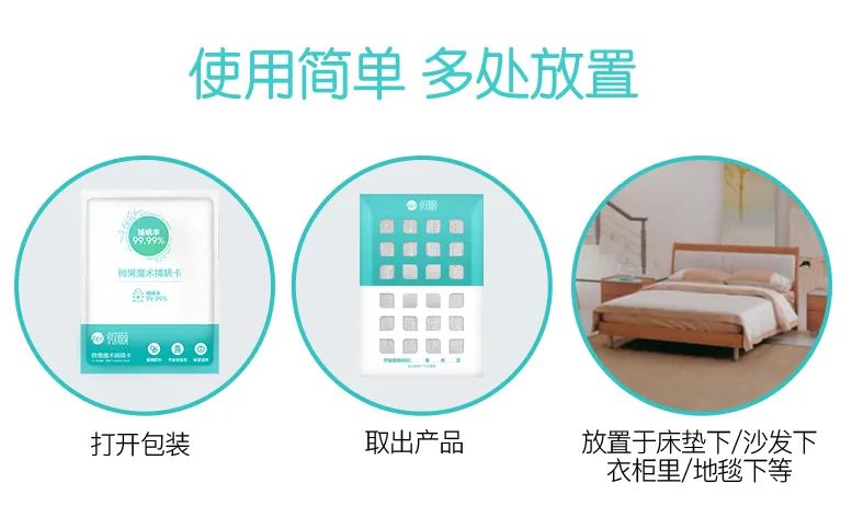 ①将捕螨卡袋撕掉,②取出捕螨卡,③放置再床垫下、枕头下、衣柜内、沙发垫下即可;