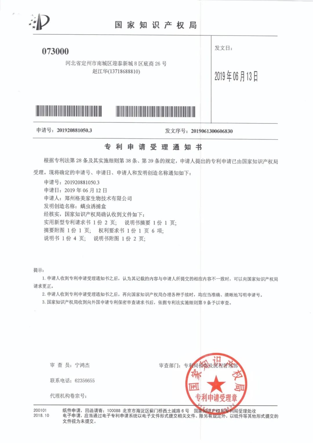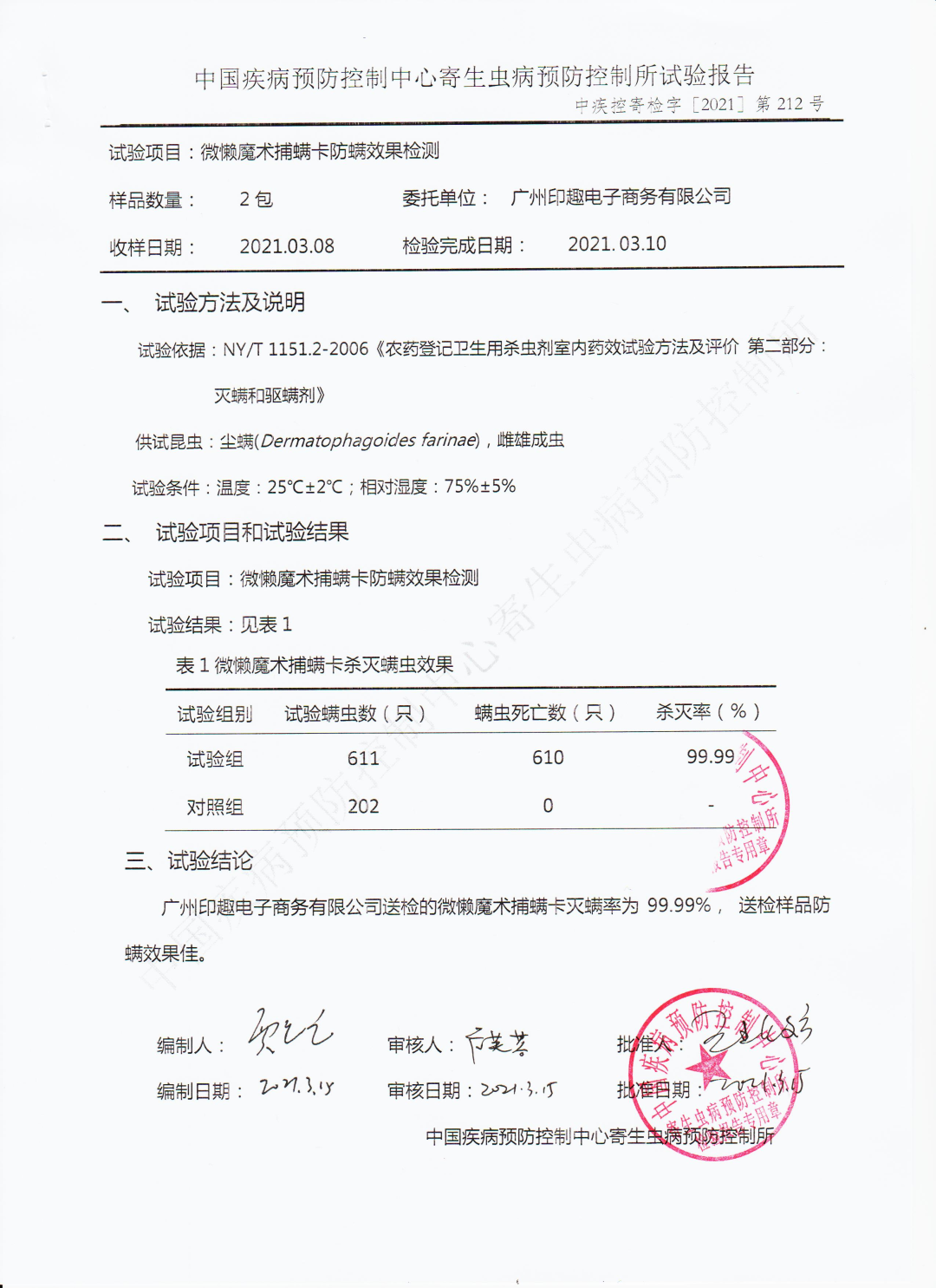 经国家疾病预防控制中心寄生虫预防控制所试验检测,捕螨率高达99.9%;