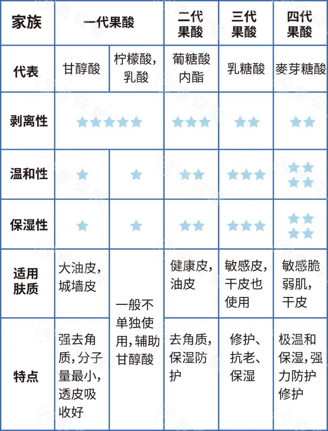 作为刷酸界的“元老”,果酸应用历史悠久,最早可追溯埃及艳后时代,陆续更新有四代了。从第一代身材娇小脾气火爆的甘醇酸,到二三代的多羟基酸(乳糖酸,麦芽糖酸),温和性和保湿性一代比一代强,主要考虑到受众面,毕竟有城墙皮的人还是太少了,更多的需求是温和性。缺点就是角质层剥落能力也大幅降低。