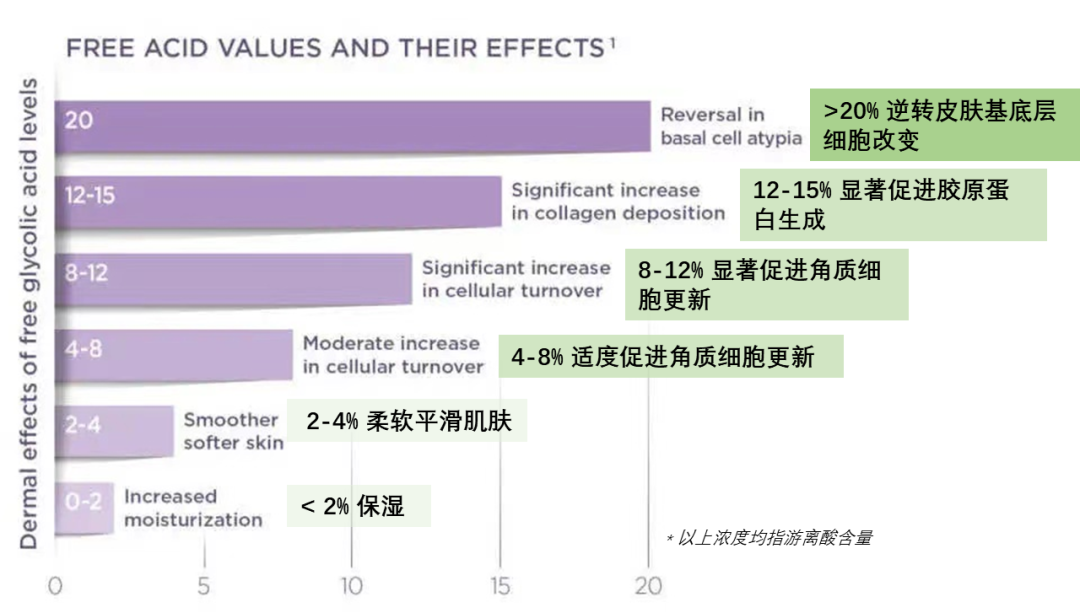 关于一代果酸浓度和功效研究比较多,放个图给大家参考。浓度越高,剥落作用越强,20% 以上的果酸才有真正意义上的快速焕肤效果,当然这需要专业医生操作,切莫自己玩“酸”!