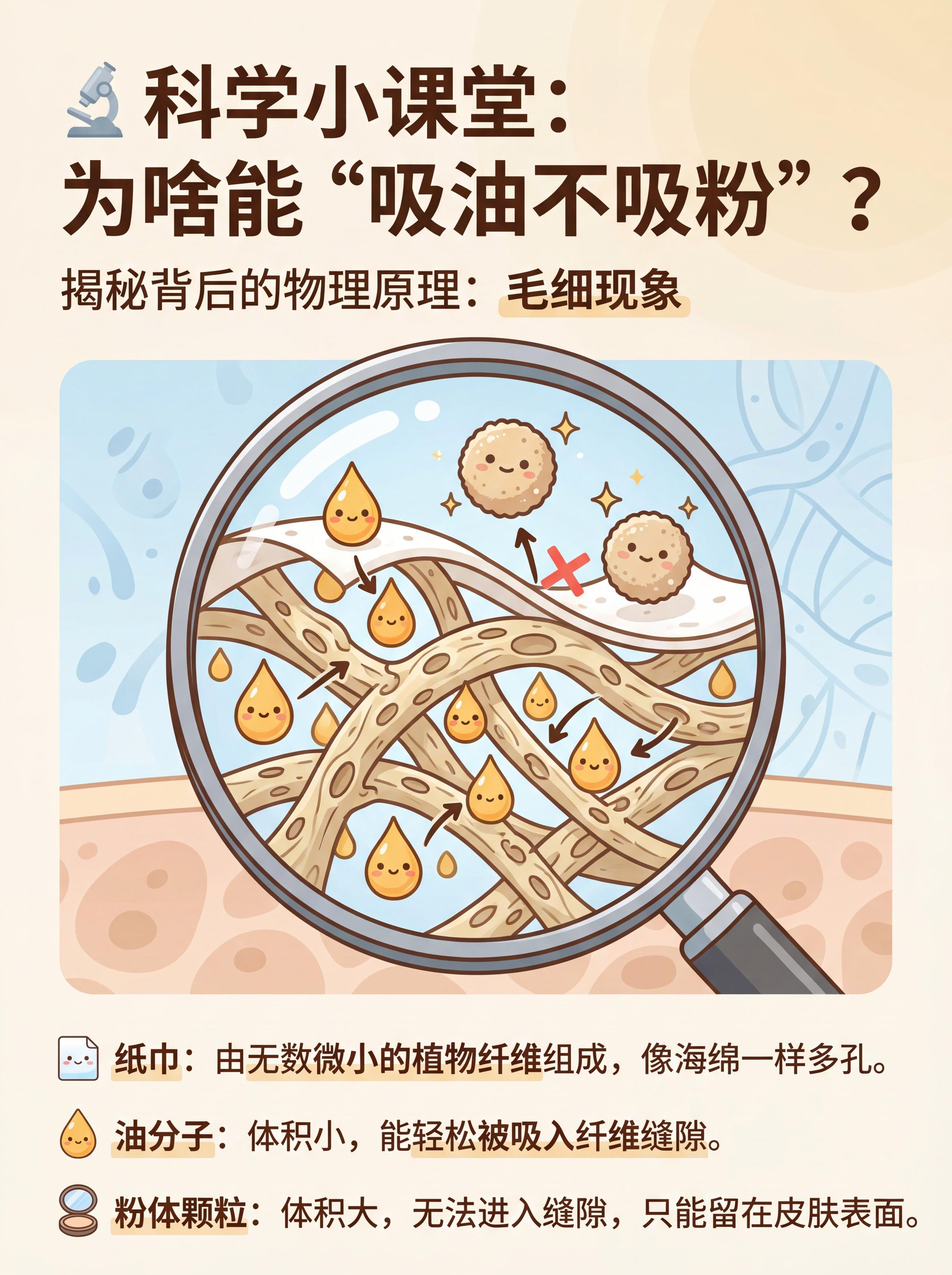 💧 油分子很小,当纸巾接触到皮肤上的油脂时,通过毛细作用,油滴会顺着纤维间的空隙被“吸”走。