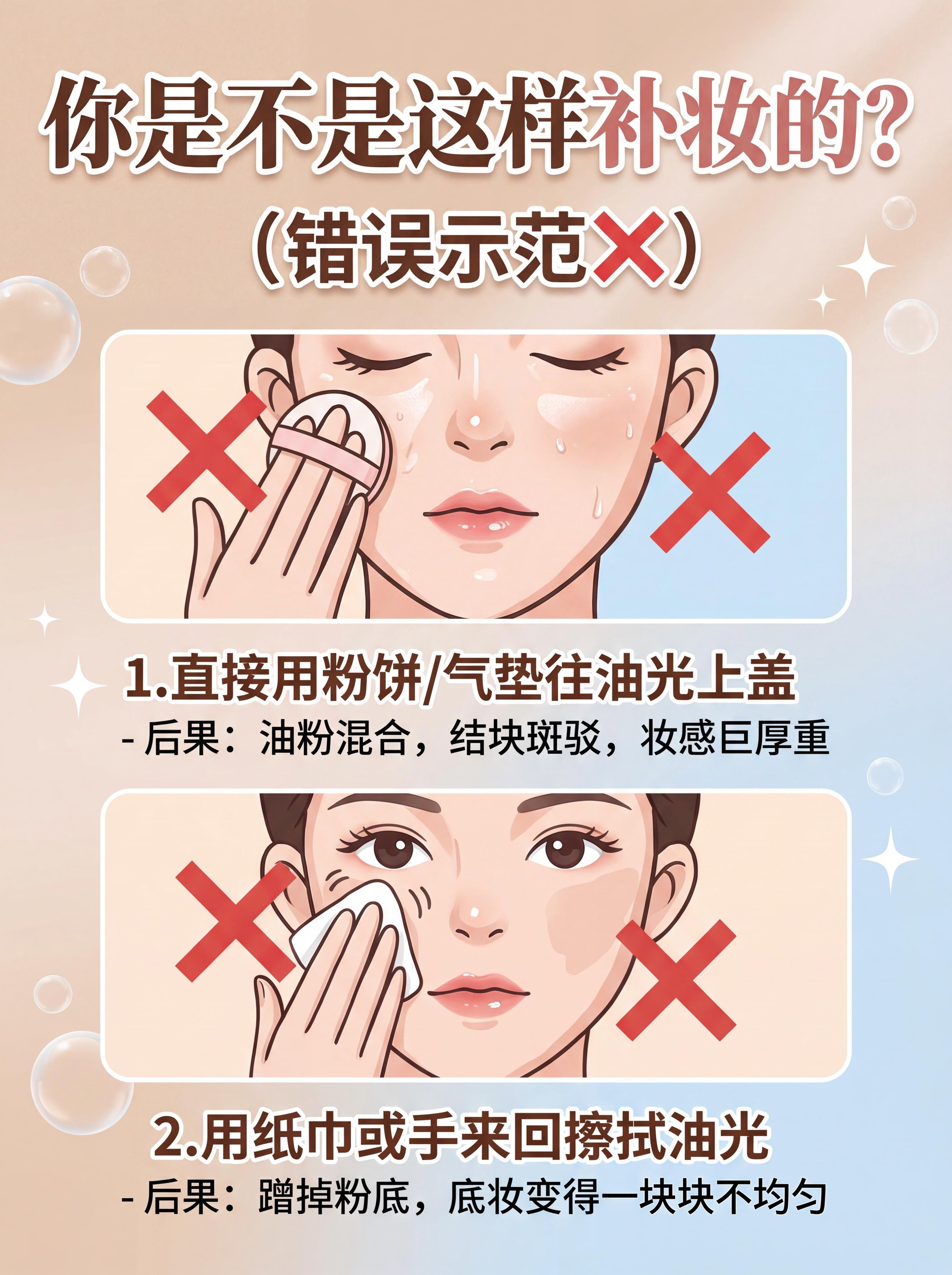 一到下午T区就开始冒油,想拿粉饼补一下,结果越补越厚,卡粉斑驳还显脏😫 整个妆面都毁了!