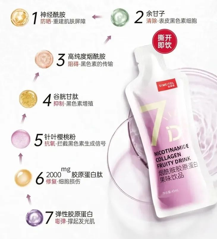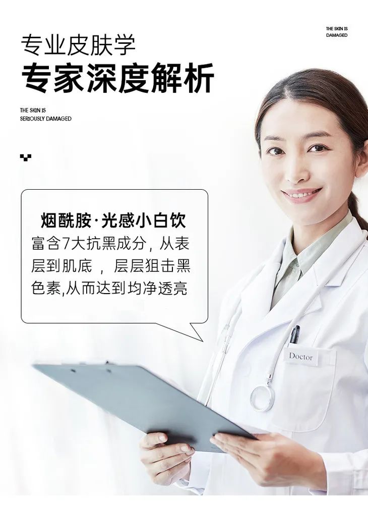 烟酰胺光感小白饮,专为亚洲特有的黄皮肤研究,从立项到上市,经上百次的配方测试,历时3年。