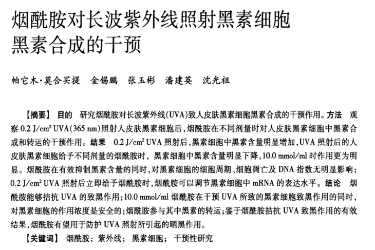 2002年[1],日本研究员Tomohiro Hakozaki的论文表明,烟酰胺可以减缓黑素小体从黑色素细胞到角质形成细胞转移。
