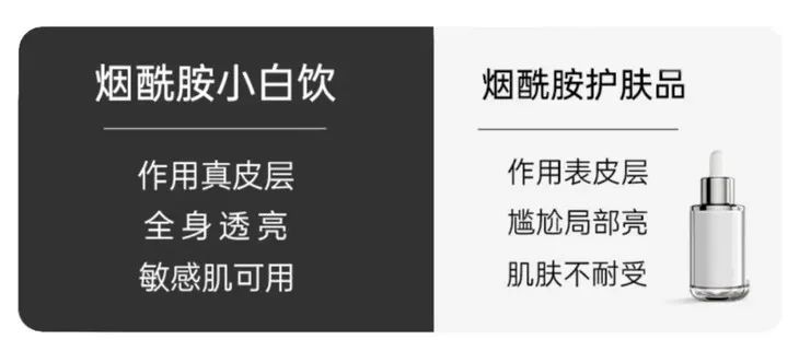 Tips:研究表明,口服烟酰胺可以通过毛细血管吸收,直接作用在真皮层。烟酰胺护肤品需要酸性环境容易引起肌肤不耐受,长期使用易变过敏肤质。
