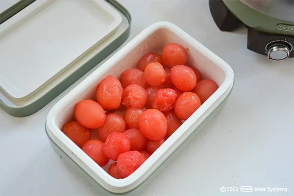② 小番茄皮已裂开,取出小番茄皮剥掉,(注意不要烫伤)放入料理盒中备用。