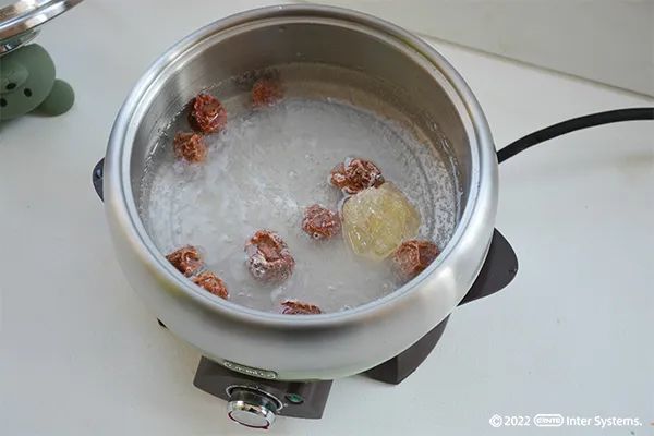 ③ 小绿锅中倒入330ML雪碧.放入话梅,老冰糖烧开,2档煮5分钟关火放凉。