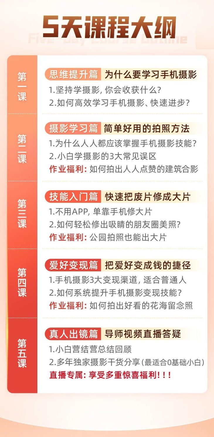 本次课程共5天,每节课都会教你2-3个实用可行的摄影技法。