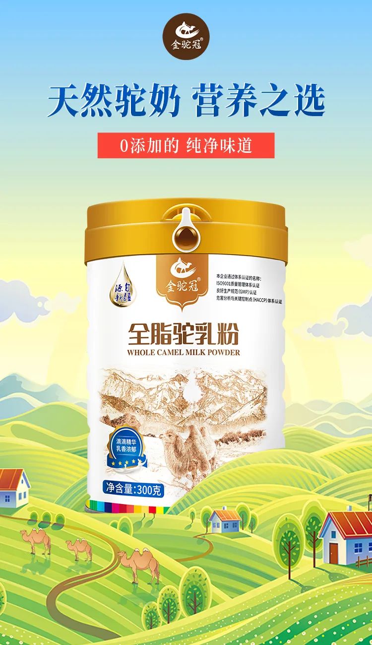 金冠驼全脂乳粉,零激素、零配方、零添加,新疆出产的纯粹好驼奶,还原骆驼乳汁营养,三高群体、牛奶过敏人群都能喝。