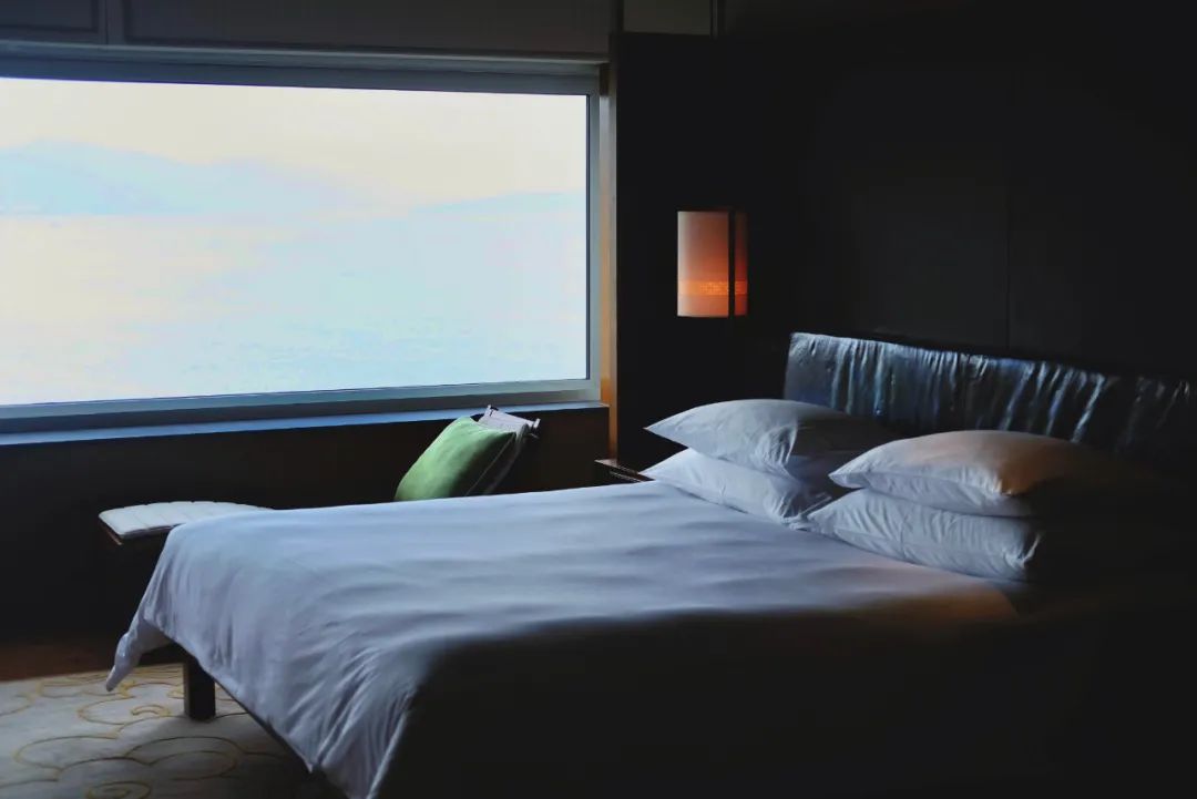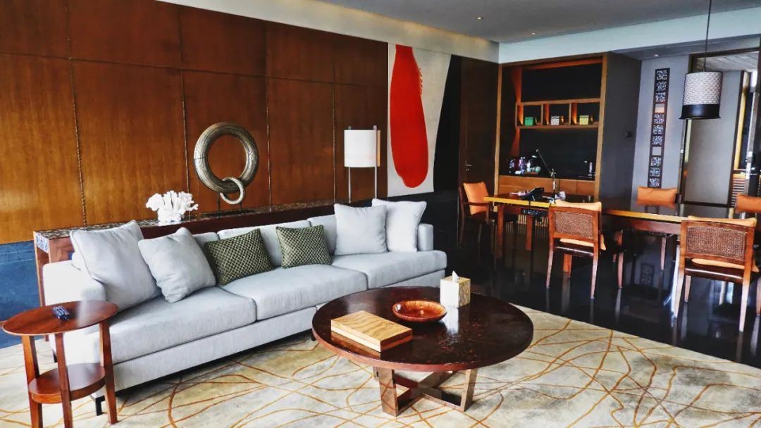 为了观海,海岛酒店大多会精心设计阳台。柏悦反而将其去掉,取而代之的是从客厅一直延伸到浴室的超长玻璃窗。透窗而望的海景更像悬挂在墙上的山水画,艺术氛围Up!