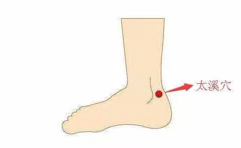 太溪穴:位于脚踝内下凹处。可以一边用两手拇指按压太溪穴,一边调整呼吸速度,总按压时间约一分钟左右。按摩此处可以改善足部冰冷的问题,此外,按摩太溪穴也有助于安定因疲劳影响的自律神经失调症状。