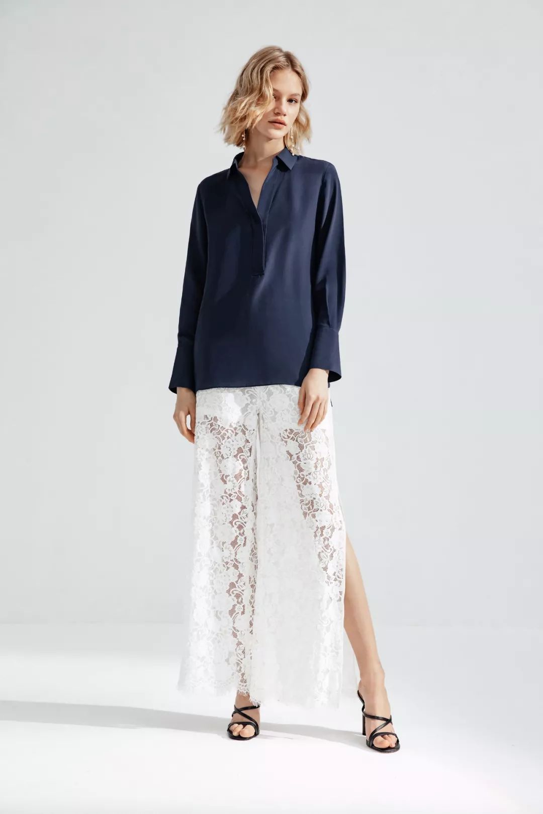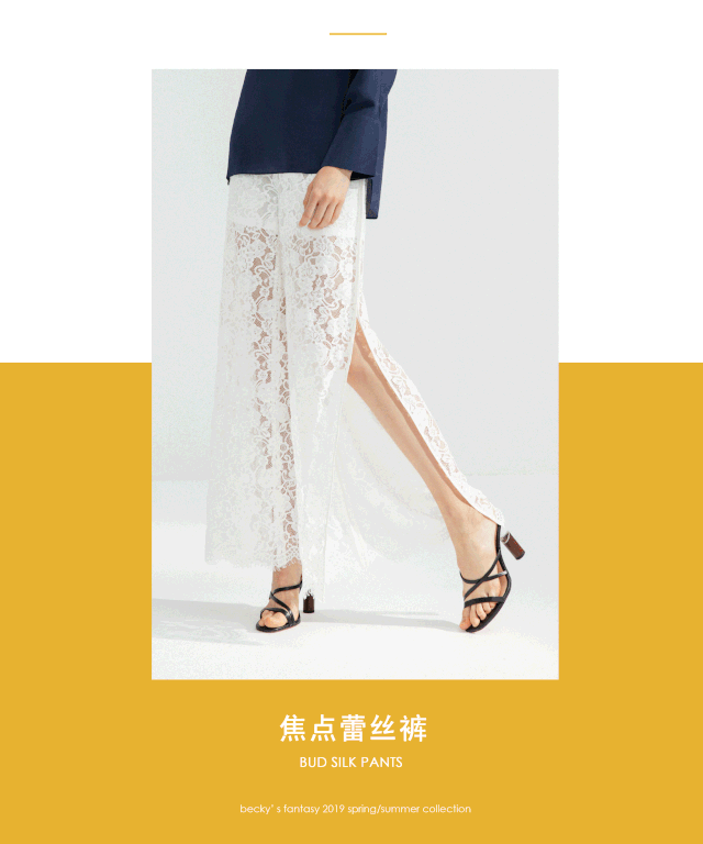 蕾丝一直是女性诠释女人味的一种方式,这次设计师大胆创意,将睫毛蕾丝融入长裤中,为中干的直筒裤增添了不少温柔气质,再加侧边的开衩细节,更是散发出迷人的魅力。