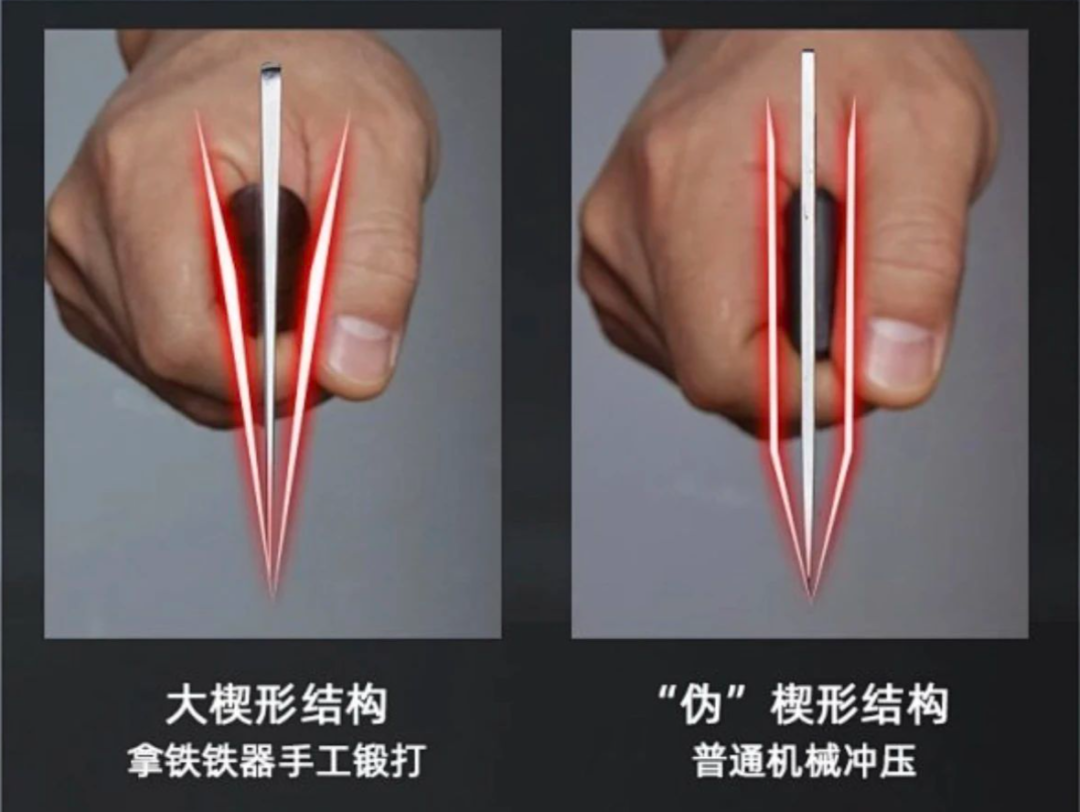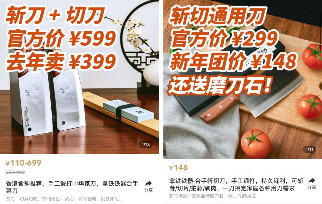 现在,我给身边朋友介绍的时候,总夸它是一把千锤百炼,可以传家的好刀。因为这把刀要经过高温煅烧、冷热锻打、塑型、剪材、淬火、磨刃、抛光7道工艺才能成。特别是手工捶打过程,是真的千锤百炼。去除了钢件中的杂质,提高了刀胚密度,从而增强刀的韧度。只有经历过这个过程的斩切刀,硬度才会很高,也不易开裂、不易崩口。另外,淬火时用的工艺也不一样:要用菜籽油,淬刃不淬背。刀身不淬火,保持高强度,让韧性更好,拍打不易断裂。而这把拿铁铁器斩切刀,硬度达到了58~60HRC,比手术刀还硬,锋利又好磨。不止便宜好用,这把斩切刀还特别精美,每一个细节都为使用者在考虑。刀身上有楷书“合手”两个字,是拿铁铁器始终坚持的理念。如果当做礼物送人,都不用多说,亲朋好友拿到手就知道是好刀!刀根呈圆弧形,不硌手,经年累月的使用手部也不容易起茧子。鱼肚型刀刃的设计,不会太直,否则发力无法集中切不断食物;也不会太弯,否则切丝时容易造成食物头尾黏连,切不彻底。官方价要¥299,我们这次争取到专属的新年福利,开团价只要148元/把。我虽然没有验证过这个说法,但这是两把好刀一点都不假,希望你会喜欢。