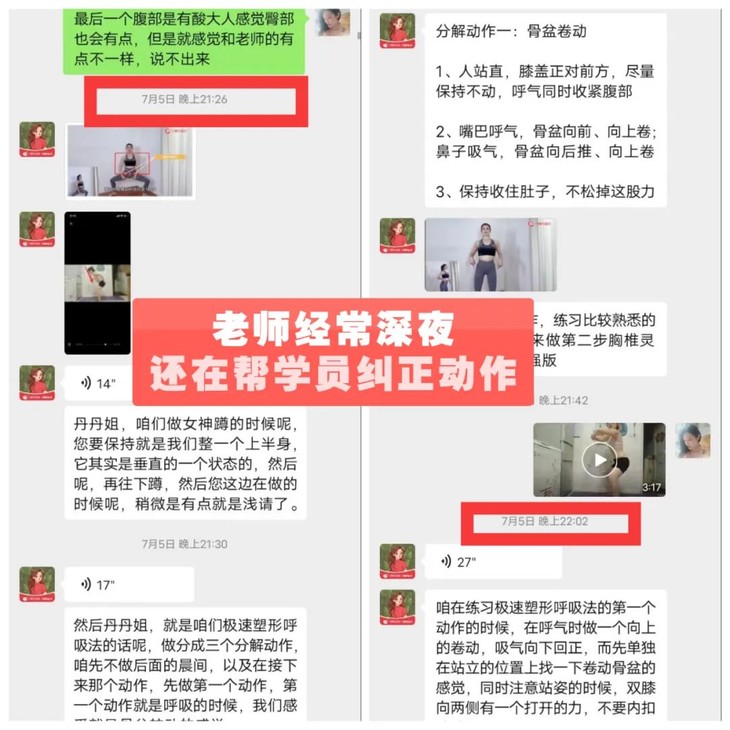助教老师还特别有耐心——不仅会把错误的动作截图,用箭头标注出来,还会发语音或者打字,细致地纠正动作。
