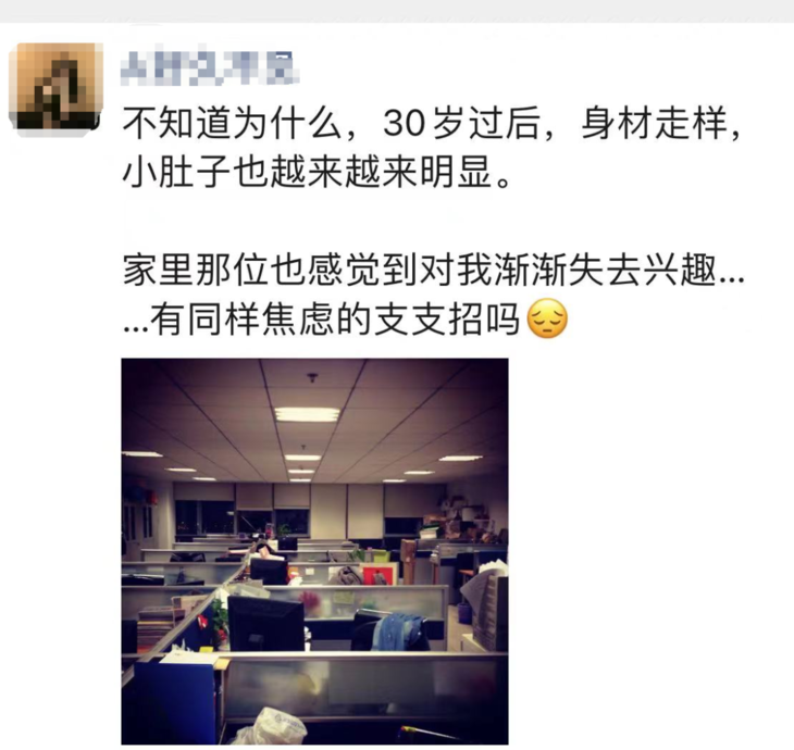 是这样的,上周看同事发朋友圈,抱怨自己身材走样,小肚子也越来越明显。