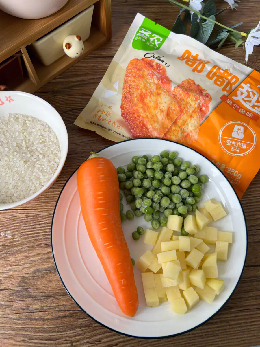 2. 大米洗净,加入2勺生抽,半勺老抽,一勺蚝油,半勺盐,一勺食用油调匀,然后依次放入胡萝卜丁,青豆,嘟嘟翅,最后加入清水没过所有食材按煮饭键