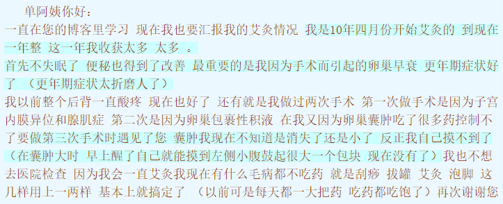 我以前整个后背一直酸疼 现在也好了 还有就是我做过两次手术 第一次做手术是因为子宫内膜异位和腺肌症 第二次是因为卵巢包裹性积液 在我又因为卵巢囊肿吃了很多药控制不了要做第三次手术时遇见了您 囊肿我现在不知道是消失了还是小了 反正我自己摸不到了 (在囊肿大时 早上醒了自己就能摸到左侧小腹鼓起很大一个包块 现在没有了)我也不想去医院检查 因为我会一直艾灸我现在有什么毛病都不吃药 就是刮痧 拔罐 艾灸 泡脚 这几样用上一两样 基本上就搞定了 (以前可是每天都一大把药 吃药都吃饱了)再次谢谢您