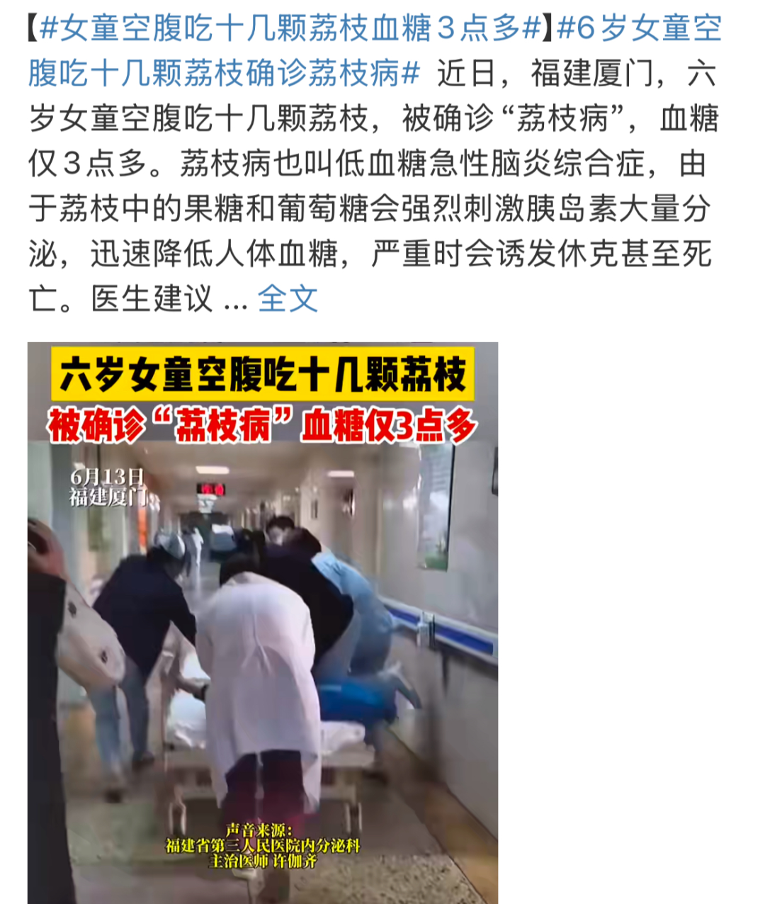 长沙20岁女孩小美空腹狂吃1.5公斤荔枝,次日血糖暴跌至2.1mmol/L(正常值≥3.9),晕倒送医抢救;
