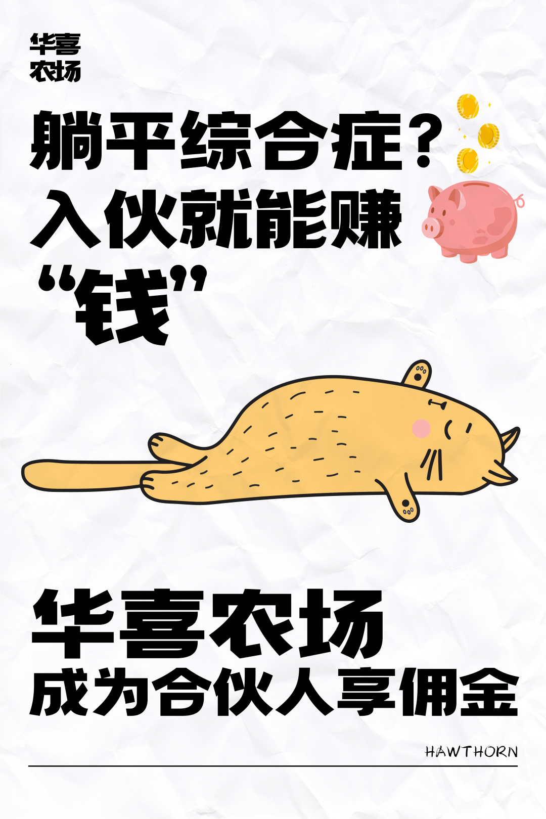 躺平是当代人民,面对生活琐事和压力下的状态。华喜农场推出“华喜合伙人”机制,入“伙”我们,每卖出一款带有“赚”字的产品,都可以得佣金。躺平的同时,不如动动手指,赢美食带来的收获。