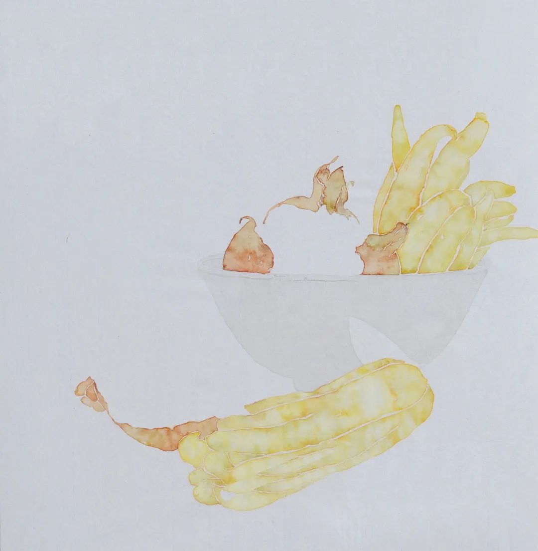 藤黄略加赭石点出佛手大形,趁湿撞入白粉;洋红略加赭石和藤黄点出石榴外皮,再趁湿用调胭脂加入少许赭石点外皮局部,略干后撞入清水;淡花青加少许赭石平涂大碗,留出叶子的位置。