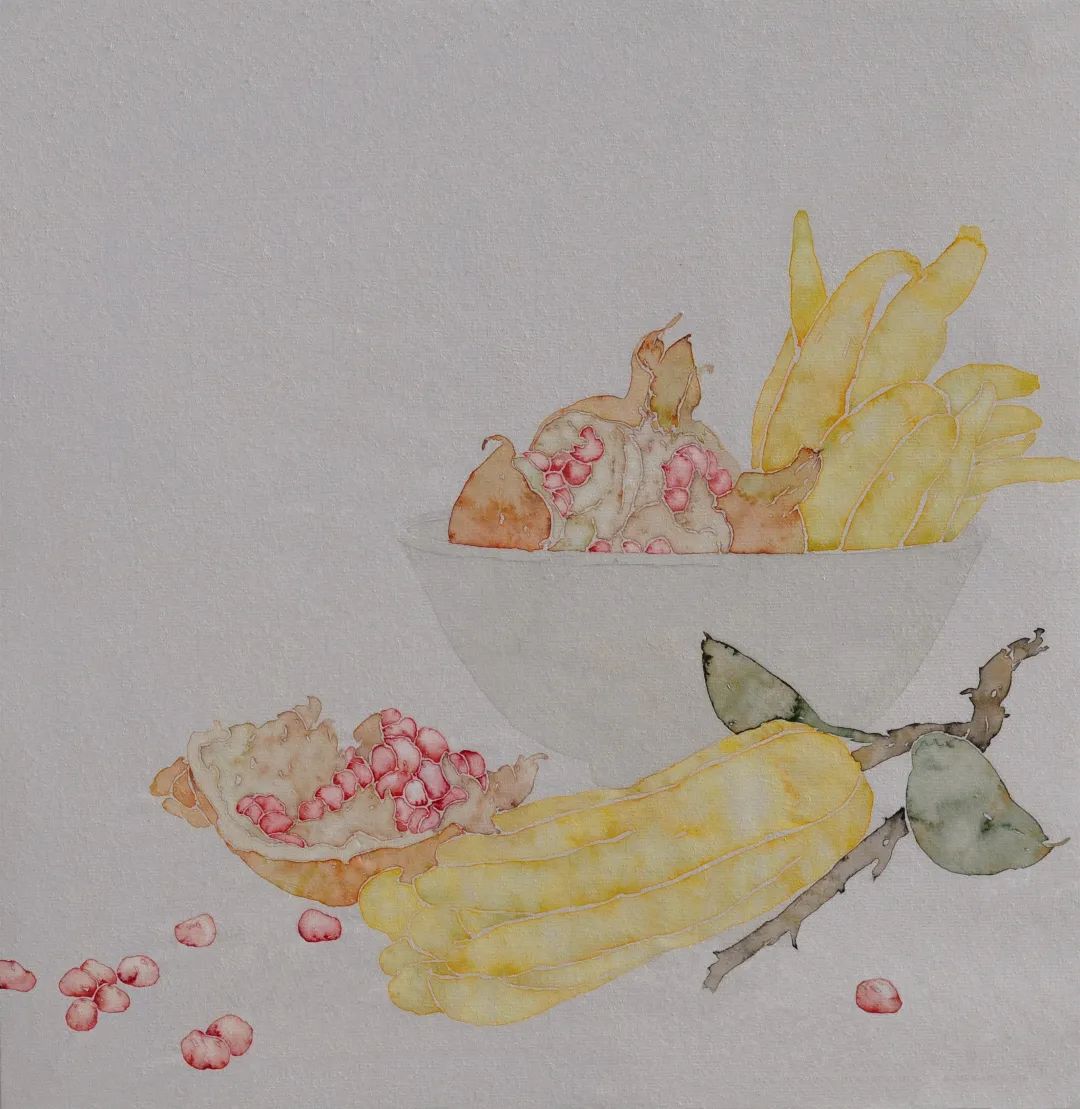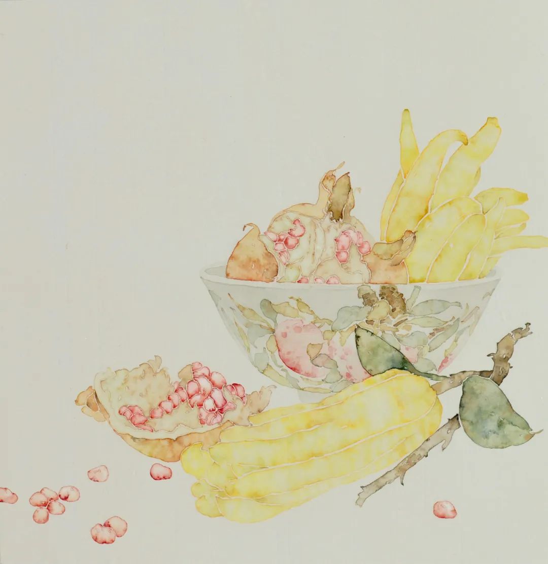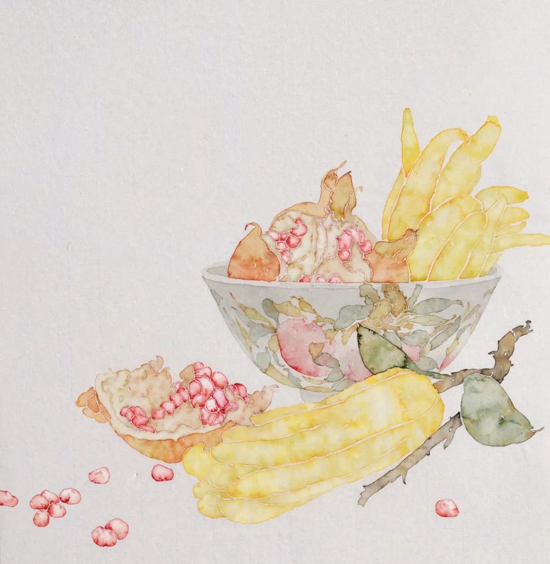 赭石墨湿笔点出碗中石榴的上端和枝条(包括碗上桃子图案和佛手)。