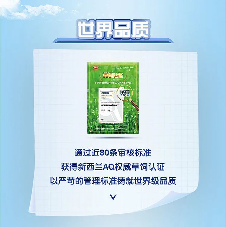 草饲奶粉本就有着极其严格的标准,睿护草饲奶粉更是通过了近80项严格的审核,是既经过了新西兰政府官方授信、又拿到了新西兰AQ草饲认证的奶粉品牌。