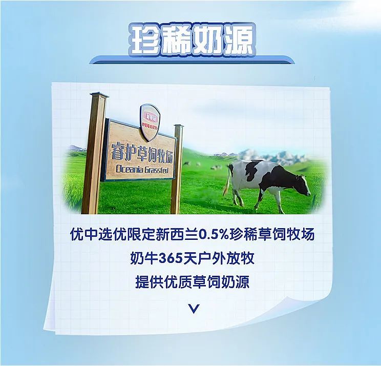 睿护草饲来自优中选优的新西兰南岛0.5%限定草饲牧场,真正实现了奶牛365天自由放牧,睿护草饲牛们每天仅挤2次奶,天天吃新鲜牧草,想象一下奶牛在这样真正0转基因、0激素、0化肥的牧场上生活,心情一定很好,产出的奶自然更好!
