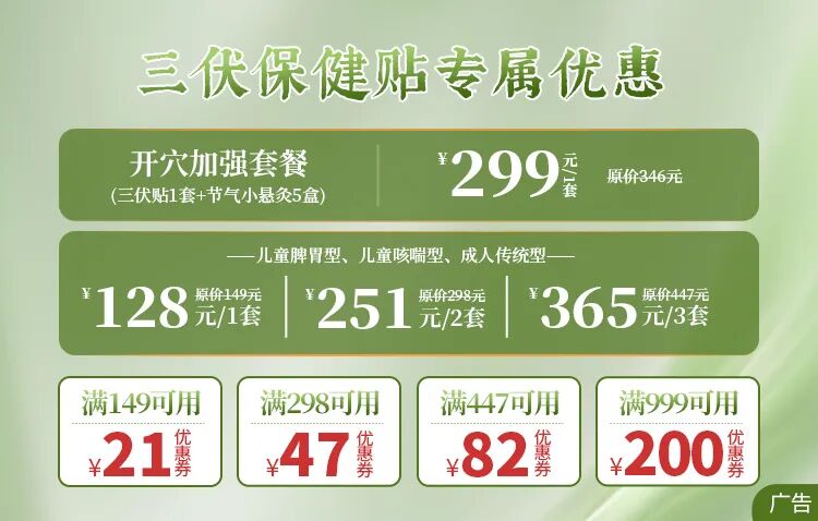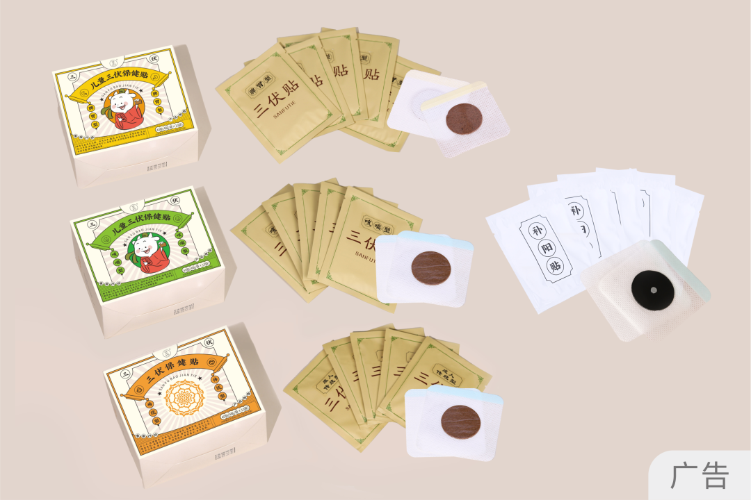 荜芨+丁香+肉桂+吴茱萸:温暖肚肚,驱赶寒气,气机道路通畅,肚肚不痛不胀,性质平和,适合宝宝,也适合成人。以三子养亲汤(芥子、莱菔子、紫苏子)为基础方,芥子把痰湿赶出体外,肺部环境清清温和,气机道路不阻碍,运行通畅;紫苏子+苦杏仁:安抚气机小情绪,不乱发脾气,内在环境平和,咳嗽、痰湿拜拜,呼吸顺畅;莱菔子消解肠道堵滞的“垃圾”,气机道路变通畅,咳咳、喘喘都不在;桃仁、桔梗、延胡索助力气机恢复正常交通,运行有秩序;甘草调和诸药,所有配料综合一起,把身心环境清理干净,像净化器一样维护内在,一切正常工作,养护身心。传统配方,适合大多数成人体质,芥子、甘遂、延胡索、川芎、洋金花温化经络,气机上下运动通畅,痰湿、水湿垃圾通通赶出体外,“咳咳”“喘喘”都拜拜;白芷、苍术、干姜:身体生起暖暖阳气,把寒气、湿气驱散出体外,助力阳气温化经络;人工麝香、薄荷脑:清凉之气疏散身体的问题,恢复正常体温,和其他诸药合用,身体对抗能力变强,身心平和,生活也平衡。3种类型的三伏贴里面都含有补阳贴,每种类型的三伏贴对应的补阳贴穴位也不一样,是因为根据今年五运六气全年阳气不足的特点,又因为大家二阳甲流后,身体阳气不足,所以在针对自然界阳气及自身阳气均处于劣势状态的情况下,特别设计了补阳贴。
