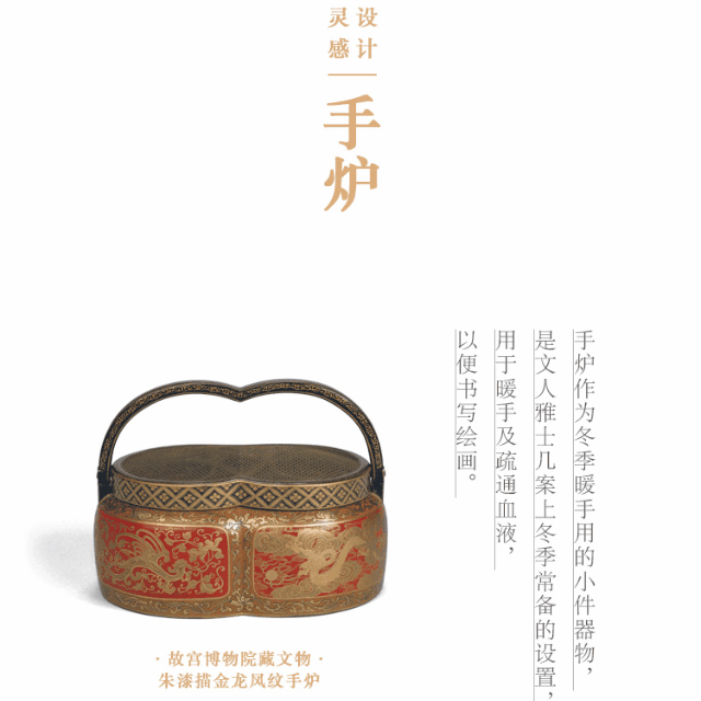 它以宫廷手炉为灵感,结合故宫博物馆珍藏的吉祥福禄寓意文物;用现代工艺制作,集众多美好于一身,呈现出多姿多彩的艺术风貌。