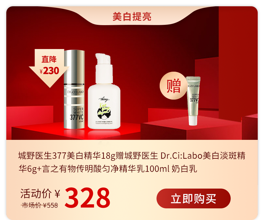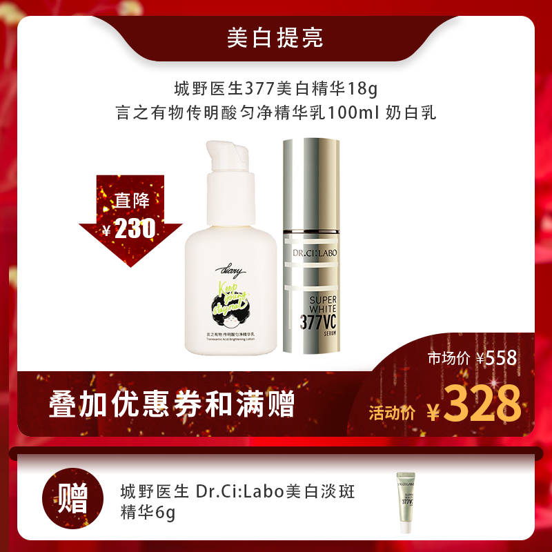 虽然现在各式各样的美白成分争奇斗艳华山论剑,377的地位始终不减当年。几天也让大家发一波“7难财”给大家带来了最经典的城野医生377~不过,城野医生的377能让你白的成分不只377。还有VC、维生素E、白藜芦醇、富勒烯等重量级抗氧化选手,配合洋甘菊提取物、积雪草舒缓高浓度377的刺激、大量的海藻糖和角鲨烷做好基础保湿。修护舒缓+美白成分鸡尾酒,强劲温和~所以上市这么久还能占据美白精华的一壁江山!作为美白CP的言之有物传明酸匀净精华乳,自然也是一款超有料的产品,它匀净的通路覆盖全面,5%的烟酰胺,减少已经生成的黑色素向表皮转移;3%的传明酸,传明酸的作用一定程度上和烟酰胺有一点点相似,也能减少黑色素转移,同时它还能抑制酪氨酸酶和黑色素细胞的活性,减少黑斑部位的细胞功能混乱的可能;
